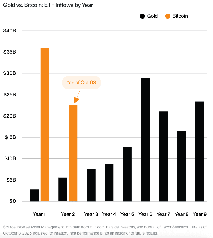 Macro conditions have turned far more supportive for Bitcoin than a year ago, even as global crosscurrents keep the outlook uncertain. The U.S. Dollar Index (DXY) has eased into the 98–100 range, a material retreat from its 2022 highs, helping lift risk assets like Bitcoin and gold. Meanwhile, real yields hover near 1.8%, high by historical standards but off their peaks, as markets increasingly price in Fed rate cuts through 2025. Softer policy expectations, falling reverse repo balances, and stable Treasury liquidity have all helped revive risk appetite, reflected in October’s tandem rally across Nasdaq and crypto.