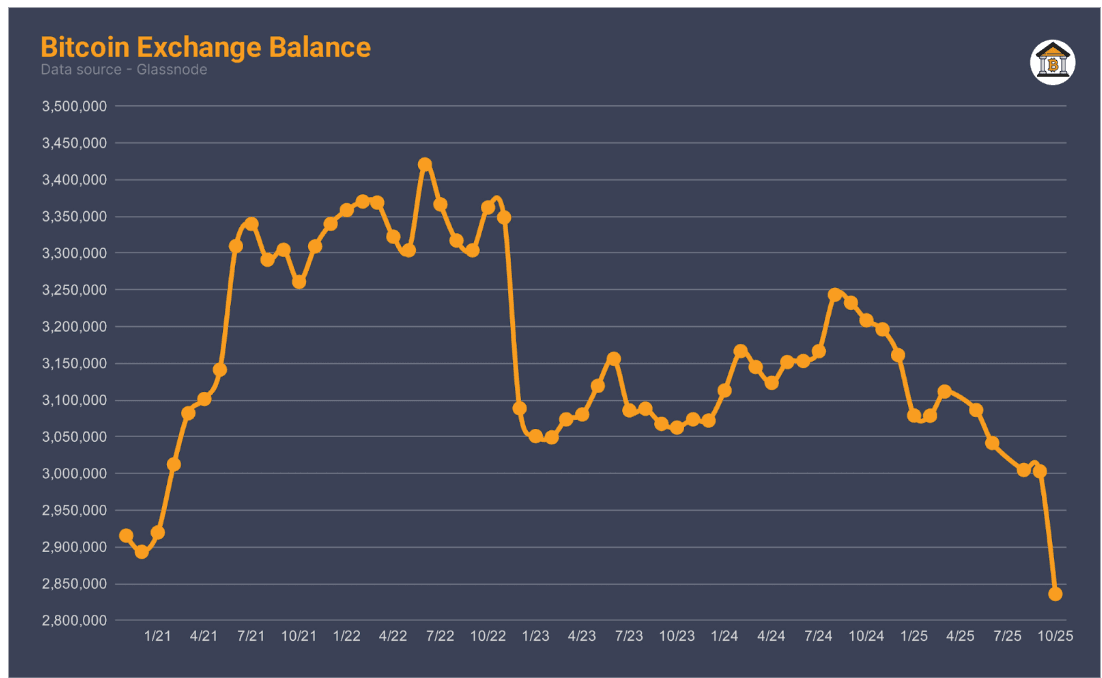 Spot Bitcoin ETFs have become the defining force of this cycle, creating a powerful gravitational pull on price. In just 21 months, BlackRock’s IBIT has amassed nearly $99 billion in assets, while total U.S. Bitcoin funds now hold roughly 7% of supply. These record flows have soaked up spot supply, driven volumes to multi-month highs, and offset profit-taking from long-term holders. With exchange reserves at multi-year lows, fewer coins remain available to sell, tightening the market’s free float.