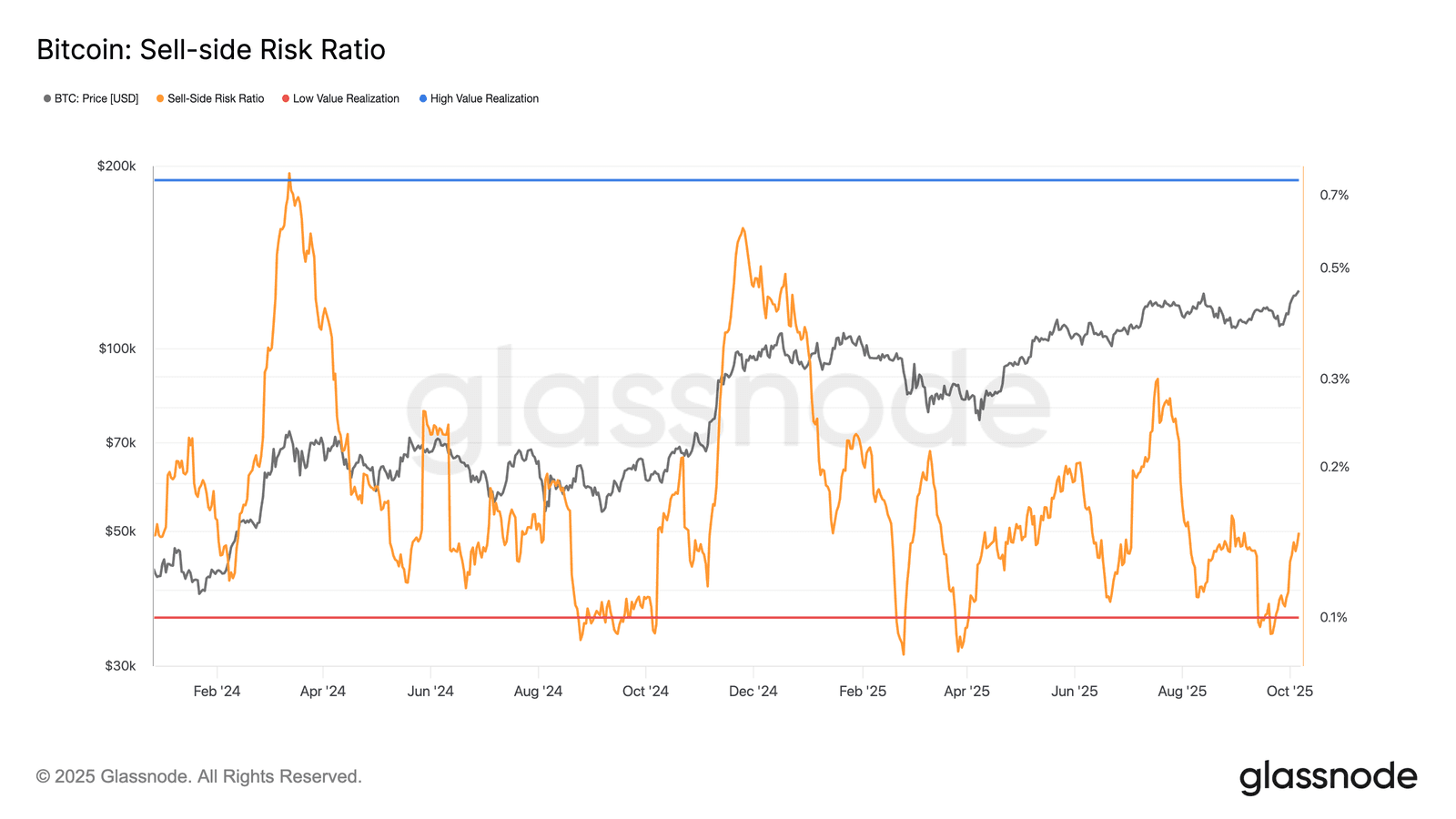 On-chain data points to growing profit-taking, but without panic. As Bitcoin’s rally pushed above $117K, nearly 95% of supply moved into profit, a classic late-cycle signal. Yet, long-term holders (LTHs) have been selling gradually, not capitulating. Glassnode’s Sell-Side Risk Ratio has risen from cycle lows but remains well below prior peaks. This shows that profits are being realized in moderation. Whales have eased their selling, while mid-tier holders (10–1,000 BTC) continue accumulating, creating a healthier ownership spread. Metrics like MVRV Z-Score (≈ 2.4) and adjusted SOPR (≈ 1.0) confirm coins are being sold at gains, but far from overheated levels — a hallmark of an orderly rotation rather than a top.