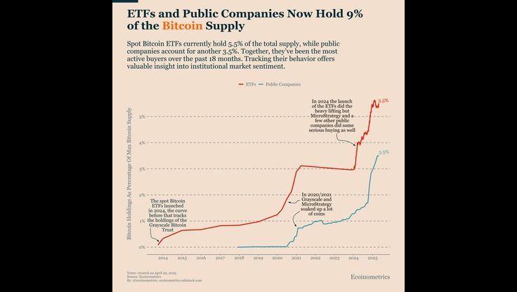 Meanwhile, according to the latest data from Ecoinometrics, spot Bitcoin ETFs now hold a staggering 5.5% of the total Bitcoin supply - just one year after their launch in 2024. Public companies, led by Strategy and joined by an expanding group of corporate buyers, account for another 3.5%. Together, these two groups now control 9% of Bitcoin’s maximum supply.